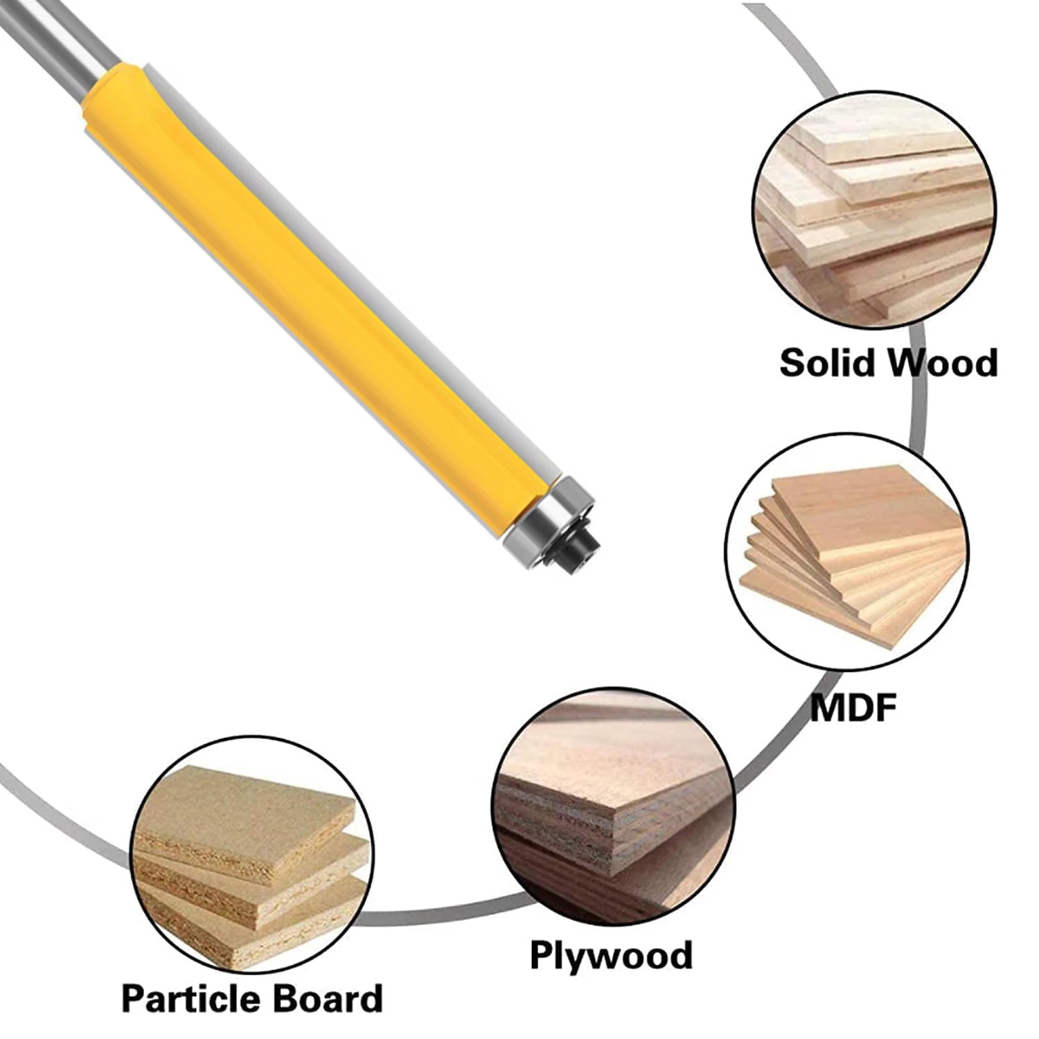 Creates smoothly radiused edges on boards and panels. Can be used without the bearing as a conventional straight bit. Great for combined plunge-cutting and pattern/template routing. Cuts all composition materials, plywoods, hardwoods, and softwoods.