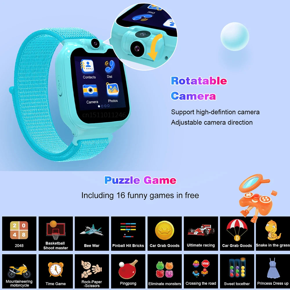 This 1.54-inch kids smartwatch combines fun and safety with 16 built-in games, a camera for photos and videos, and music playback via a 512MB TF card. It supports phone calls for easy communication and includes an SOS feature for quick emergency alerts. Designed for children, this smartwatch is an ideal gift that encourages learning and entertainment while keeping parents reassured.