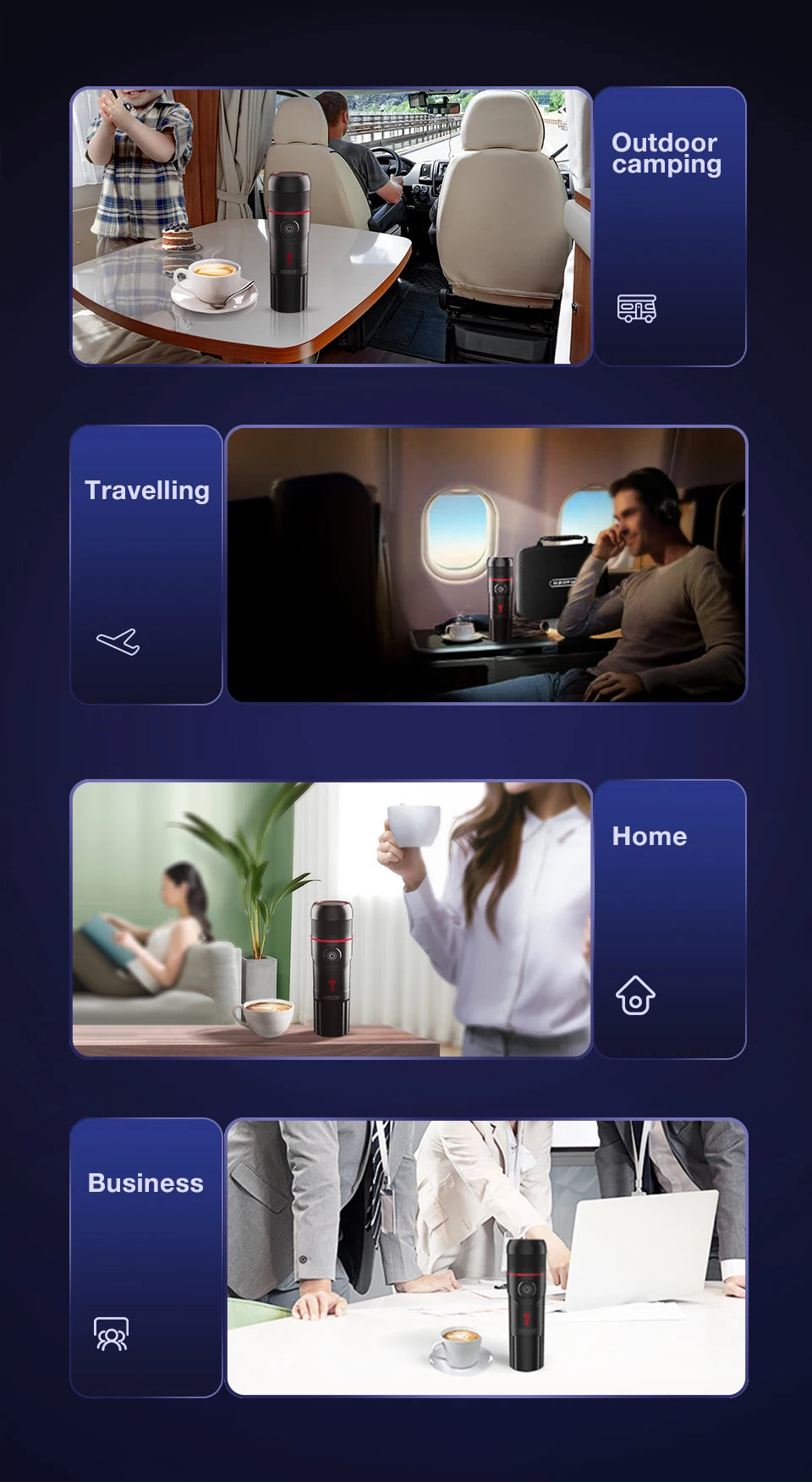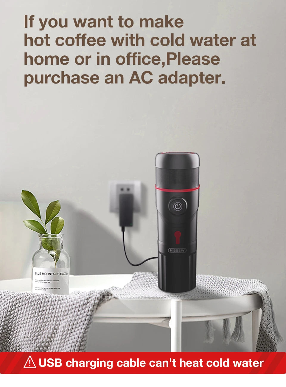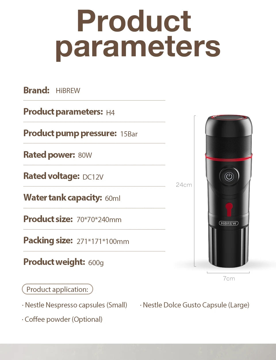 The HiBREW Portable Coffee Machine is a versatile coffee maker perfect for use at home or in your car. It works with DC12V and is compatible with Nexpresso Dolce Pod Capsules and coffee powder. The H4 model can make up to 5 cups and is specifically designed for making delicious espresso. This machine is housed in durable plastic and is categorised as an espresso coffee maker.