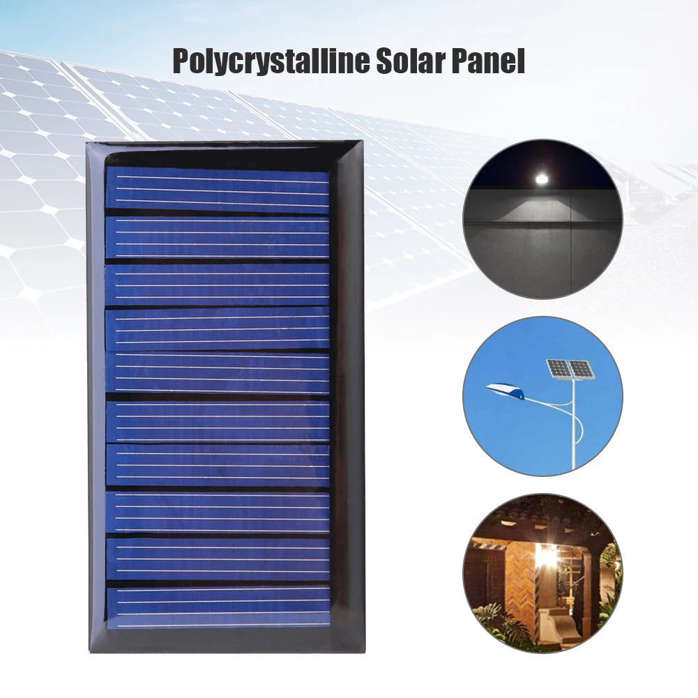 Effortlessly charge your small electronic devices with our 5V Solar Panel Battery Charger. Made from polycrystalline silicon, this DIY battery charger utilizes renewable energy to power up your gadgets. With a high output of 60mA and 1W, it's perfect for 3.6V batteries. Stay connected on the go with this compact and eco-friendly solar cell.