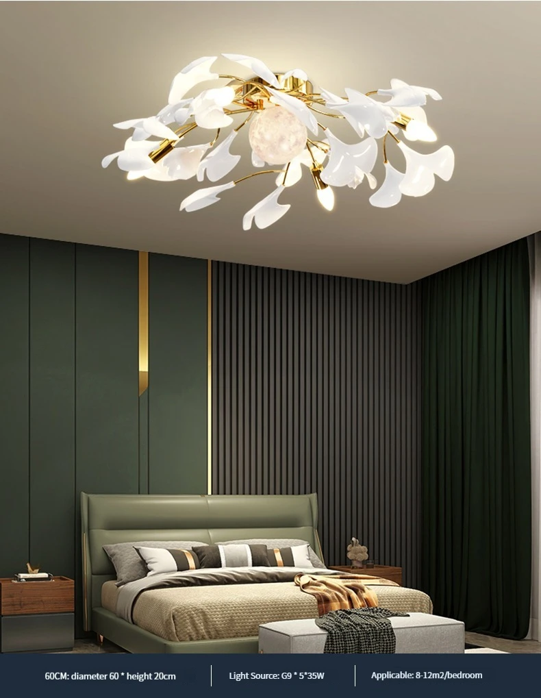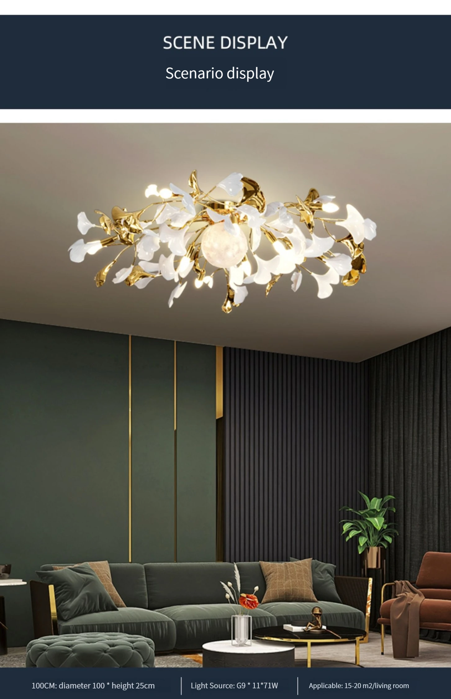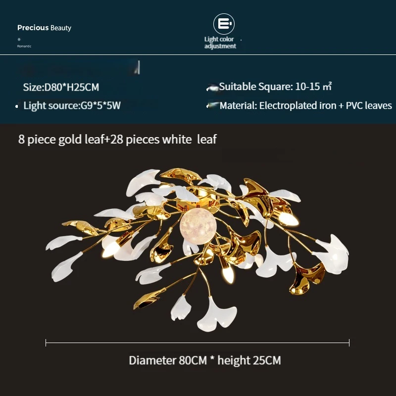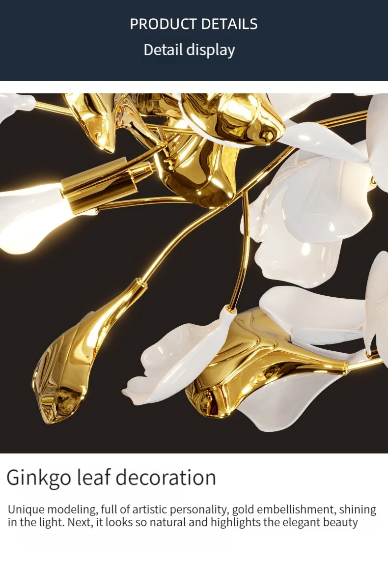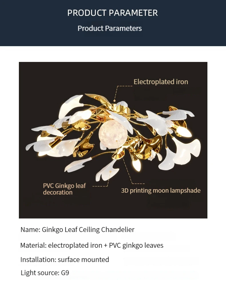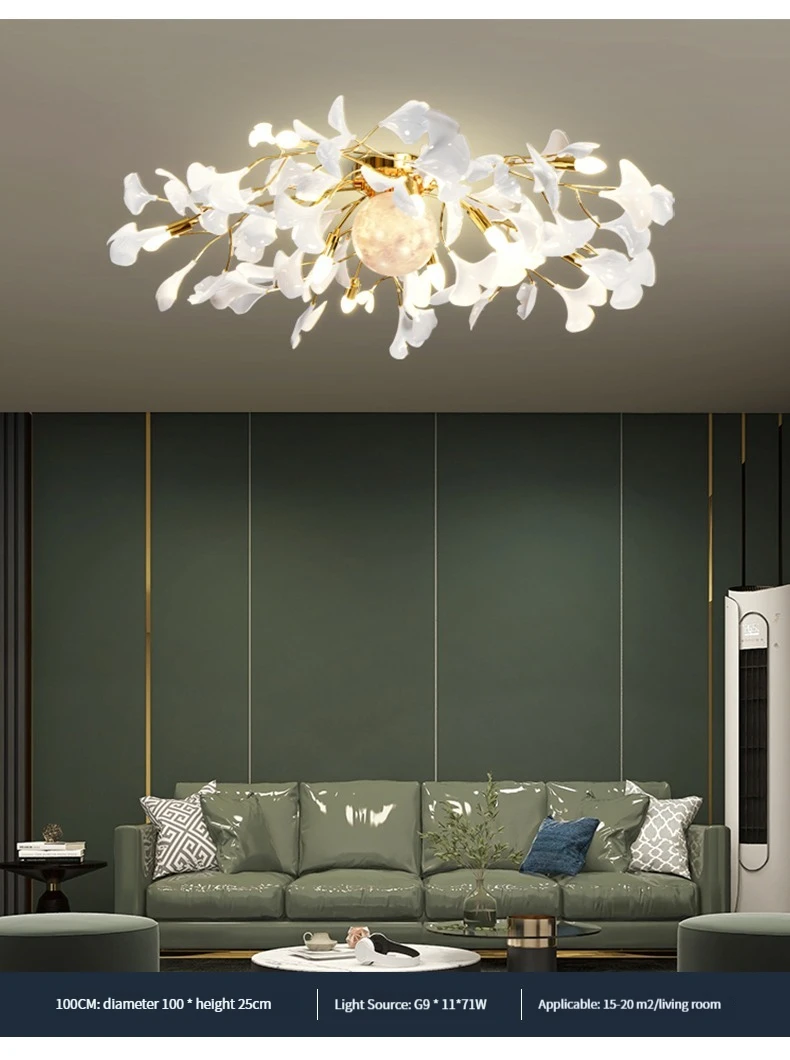Elevate your living space with this modern LED ceiling chandelier. Crafted with acrylic ginkgo leaves and sleek metal, it exudes contemporary elegance. Perfect for living rooms and bedrooms, it adds a touch of sophistication to any décor. Illuminate your home with style and charm, enhancing the ambiance with its radiant LED light.