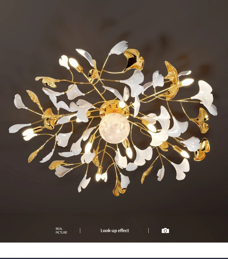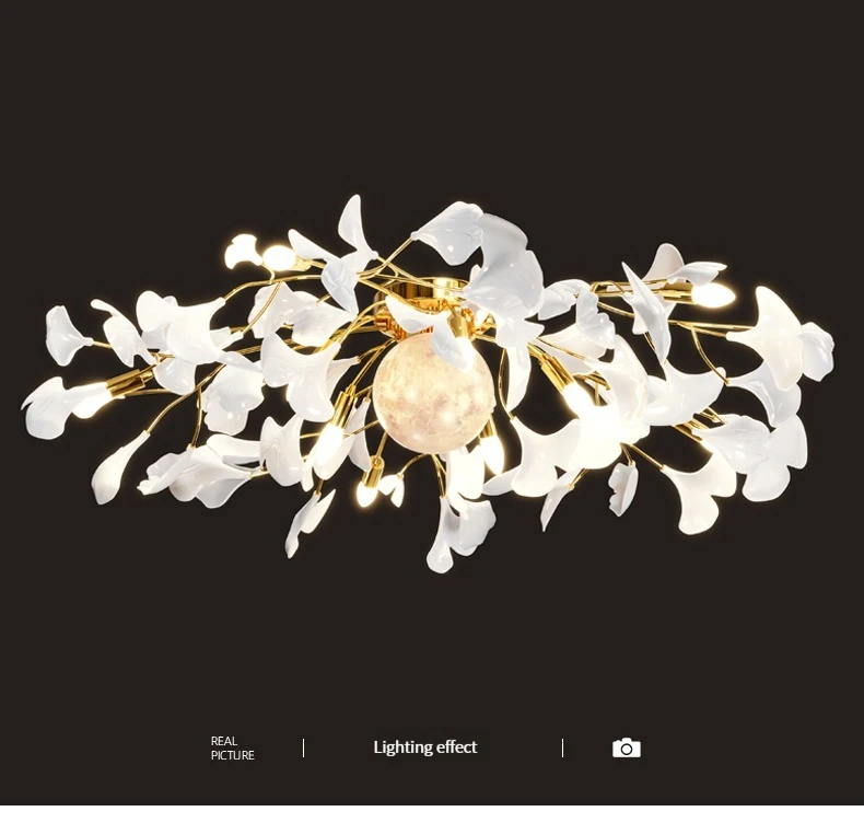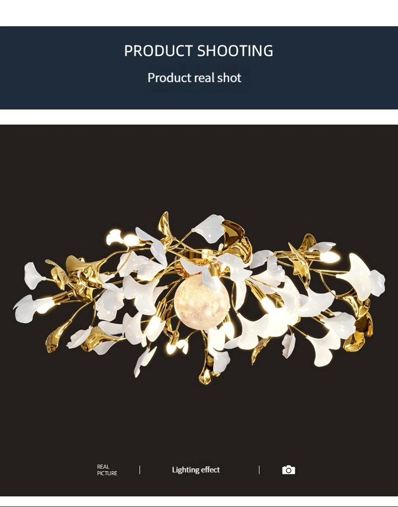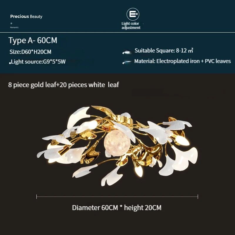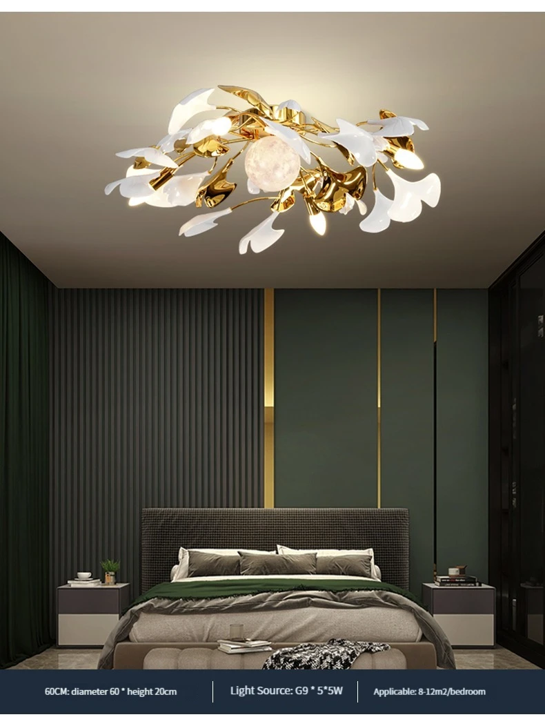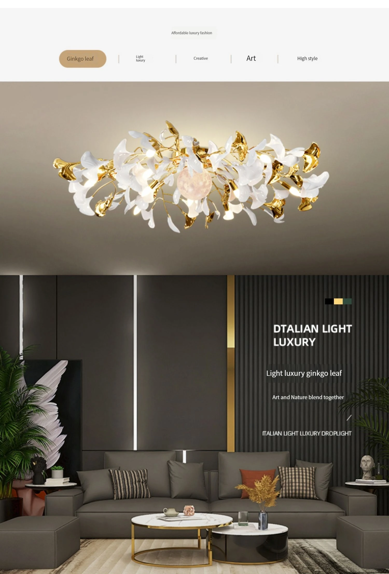 Elevate your living space with this modern LED ceiling chandelier. Crafted with acrylic ginkgo leaves and sleek metal, it exudes contemporary elegance. Perfect for living rooms and bedrooms, it adds a touch of sophistication to any décor. Illuminate your home with style and charm, enhancing the ambiance with its radiant LED light.