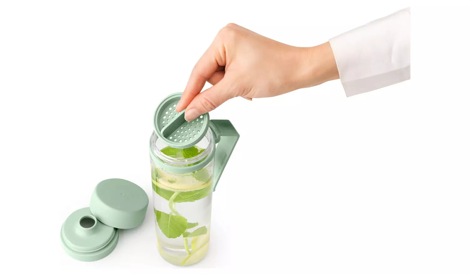 Brabantia Make & Take Water Bottle with Strainer, 0.5L. Handy hydration - water bottle with fruit sieve (500 ml). 100% leak-proof. Made for infusing - with sieve that keeps your fruit inside. Easy filling - large opening. Hygienic - handle tilts bottle for better upside-down drying. Easy to clean - dishwasher safe. Durable - reusable drinking bottle made of long-lasting materials. Problem-free use - 5 year guarantee and service. 100% recyclable after use.