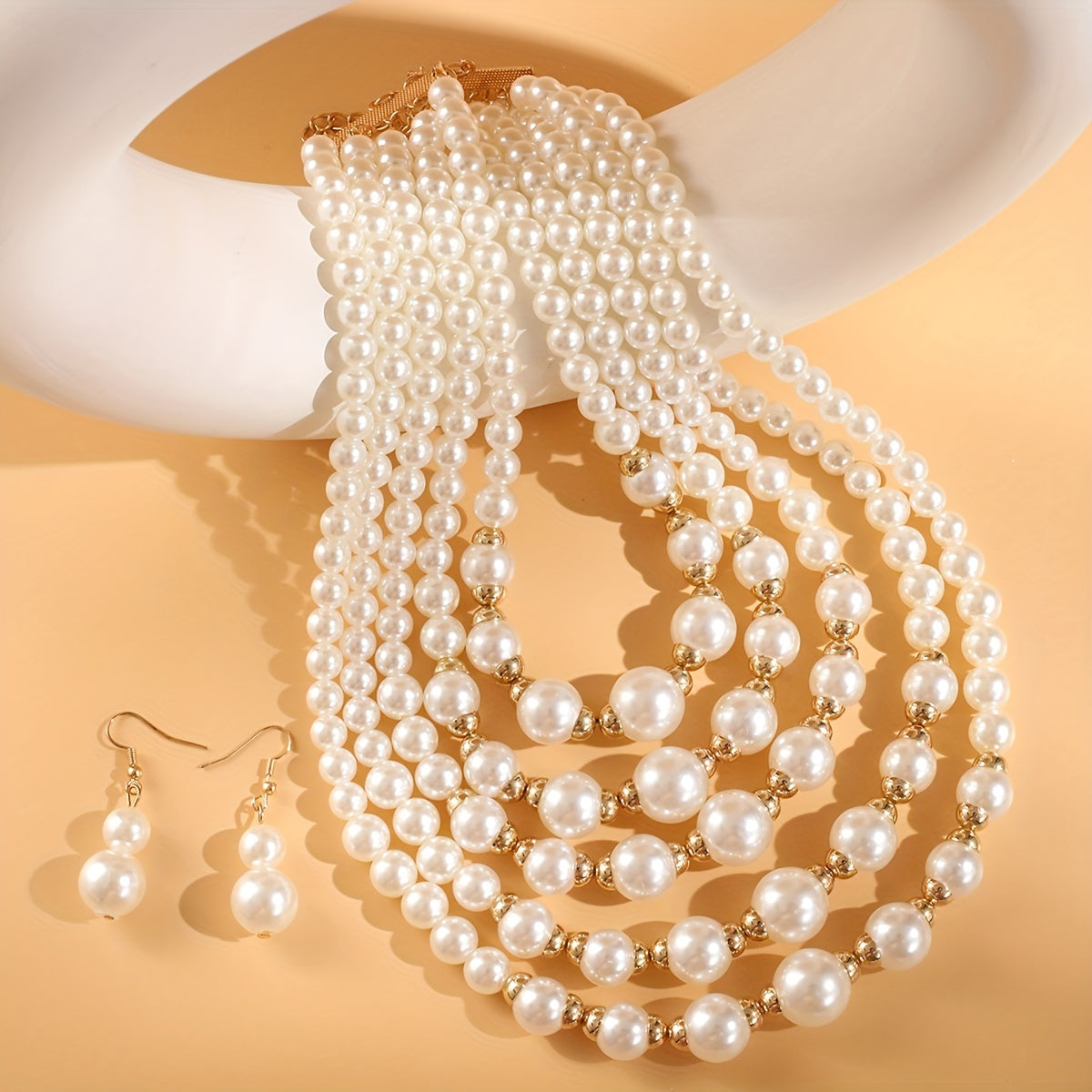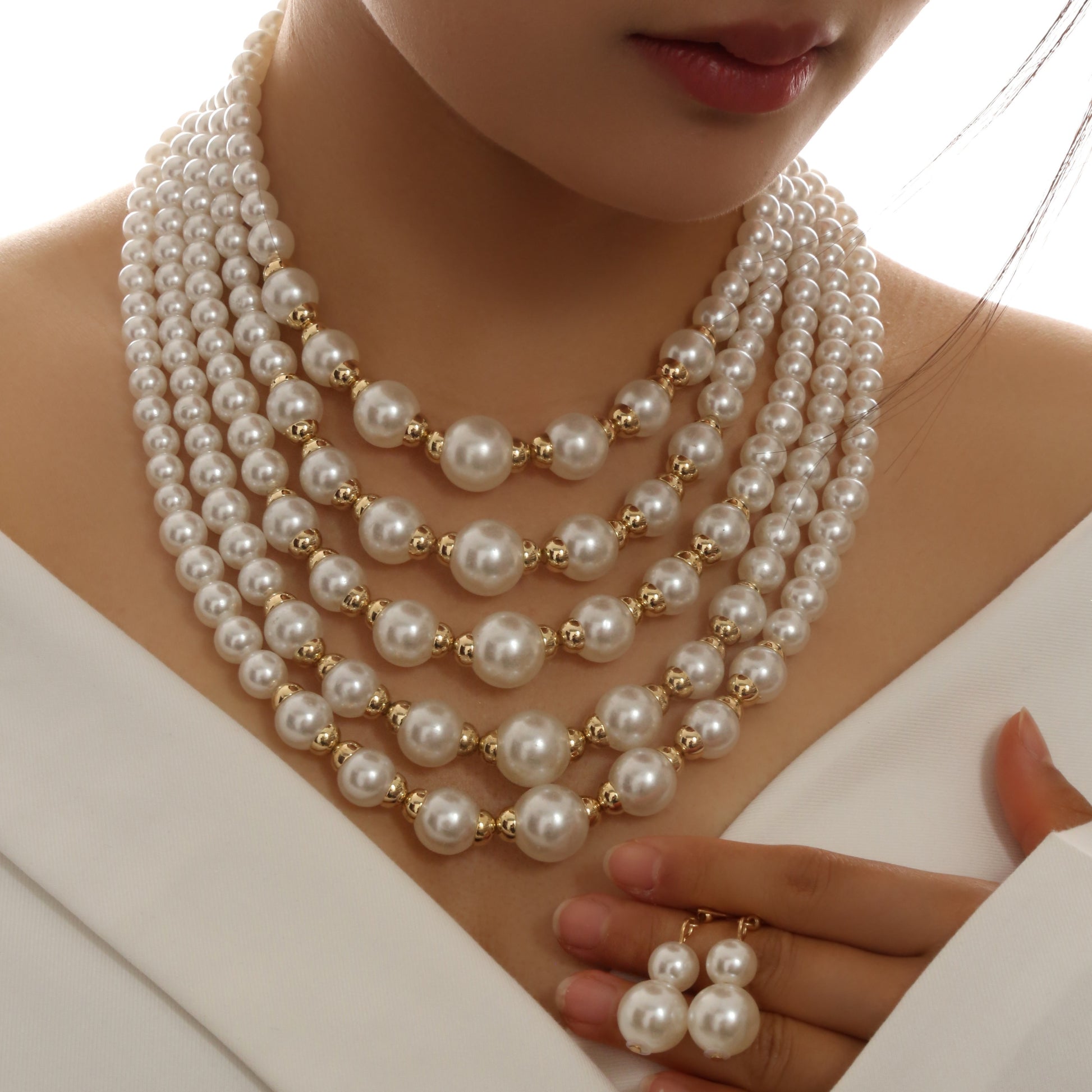 Sophistication Redefined: Elegant Multi-Layered Faux Pearl Beaded Necklace and Earrings