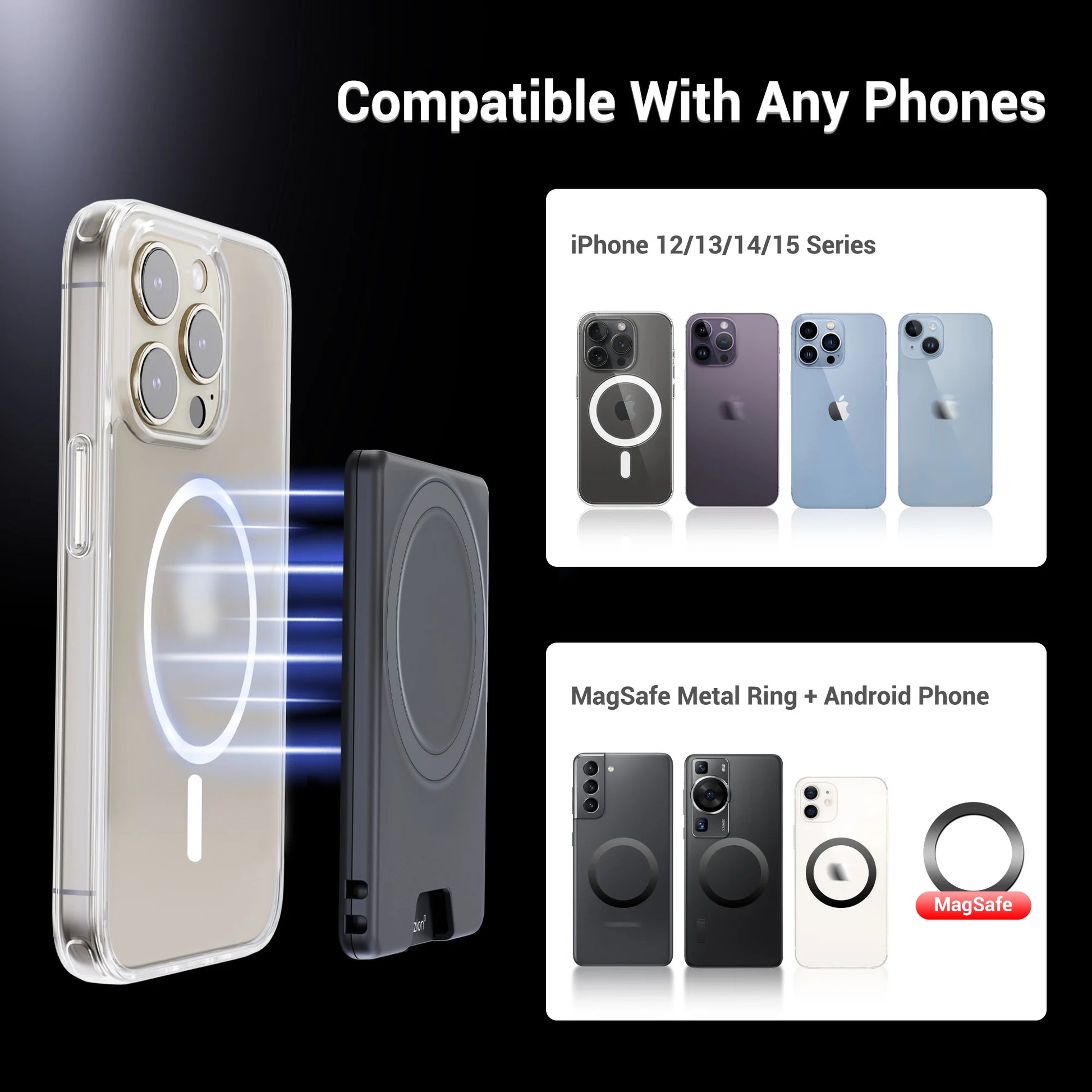 2. For MagSafe-equipped phones & official or third-party MagSafe phone cases; non-MagSafe devices, please adapt with the included 3M adhesive metal ring