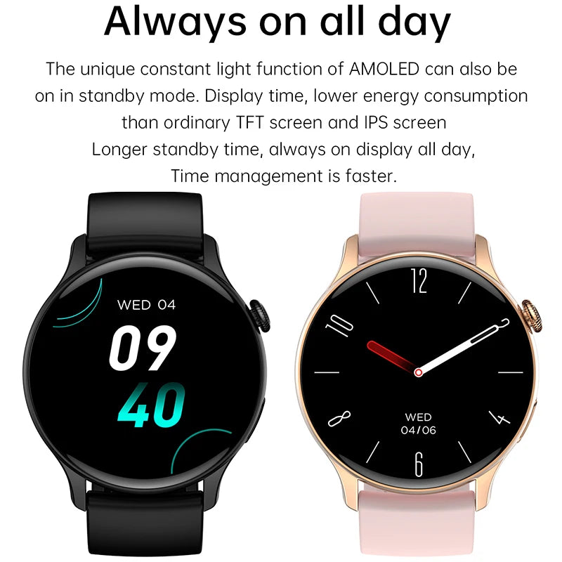 - Key features include: Bluetooth calling, voice control, an always-on display, password protection, tracking of female reproductive cycles, customisable dials, weather forecasting, music management, step count, heart rate monitoring, sleep tracking, reminders to move, distance tracking, blood oxygen levels, blood pressure monitoring, message notifications, and calorie tracking.