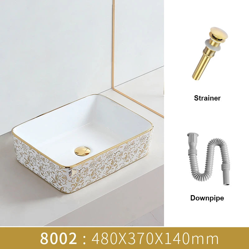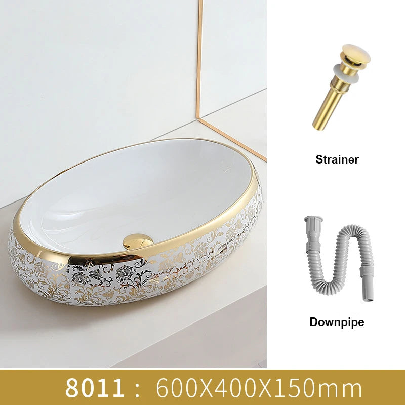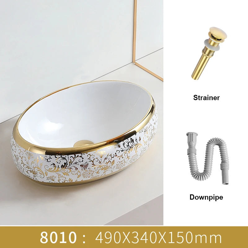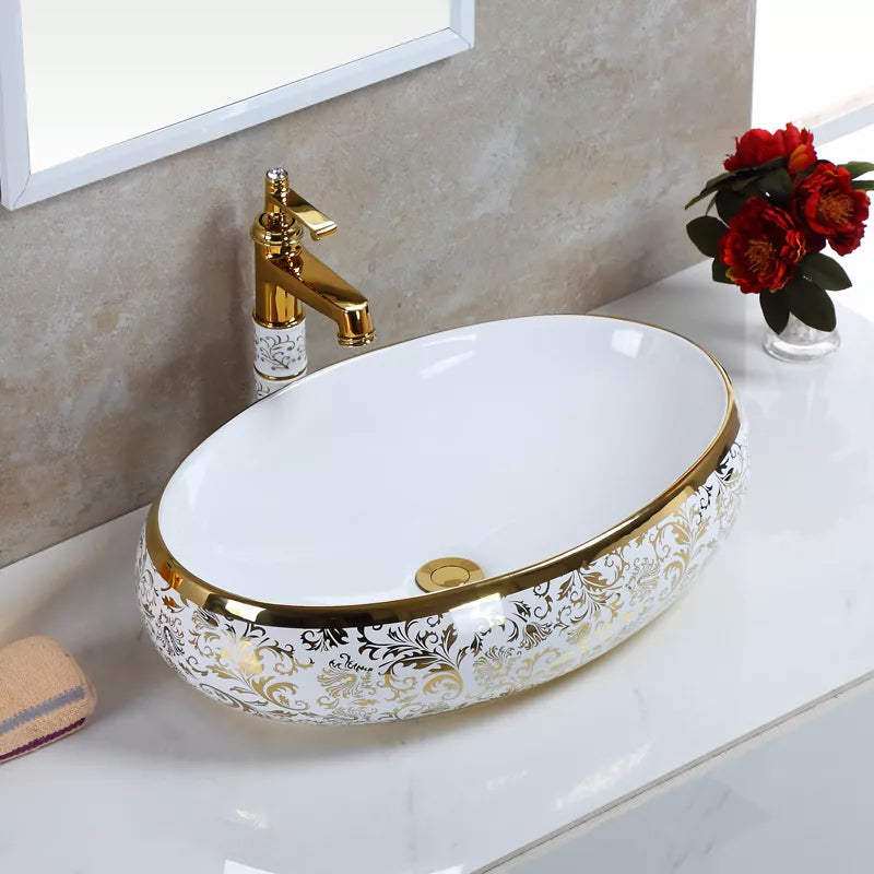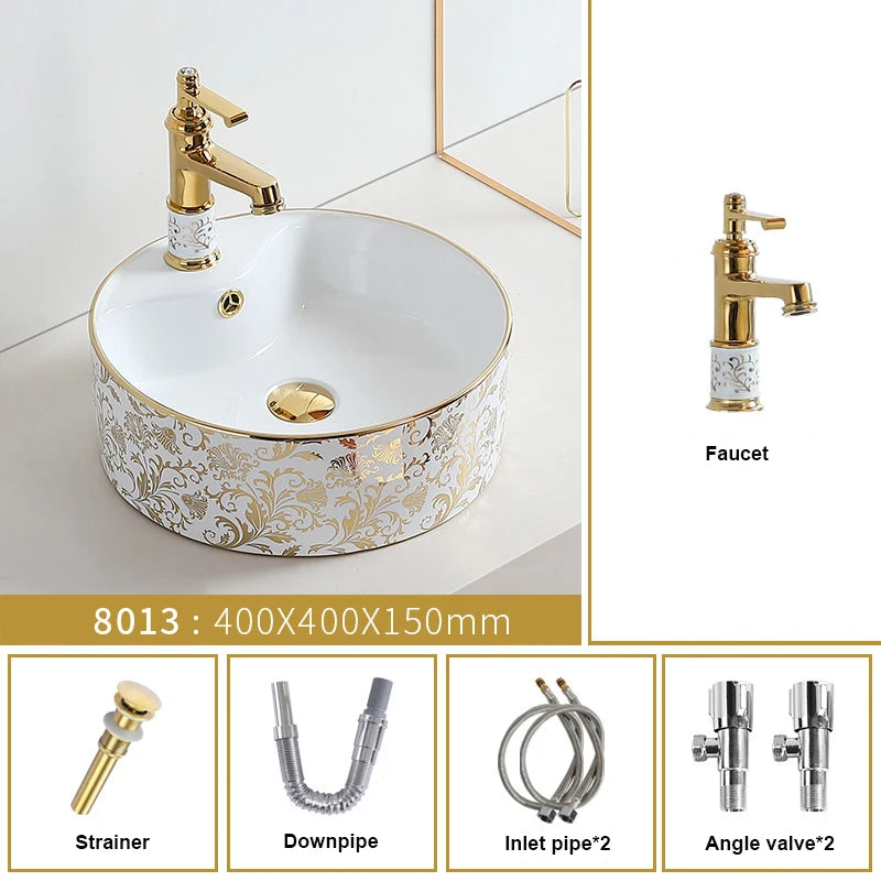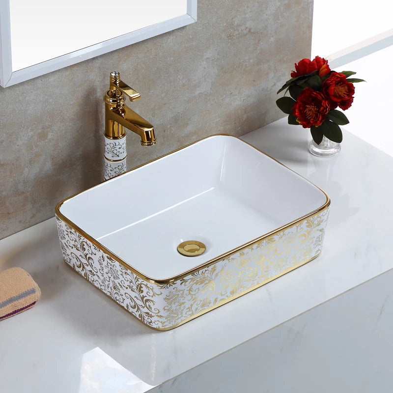 Immerse yourself in luxury with our flower design art ceramic bathroom sink set. This above-counter washbasin sink features a stunning golden bath vessel sink with intricate floral patterns. Perfect for countertop installations, this sink exudes elegance and charm, elevating your bathroom decor to new heights. Transform your space into a sanctuary of style and sophistication with this exquisite shampoo sink centerpiece.