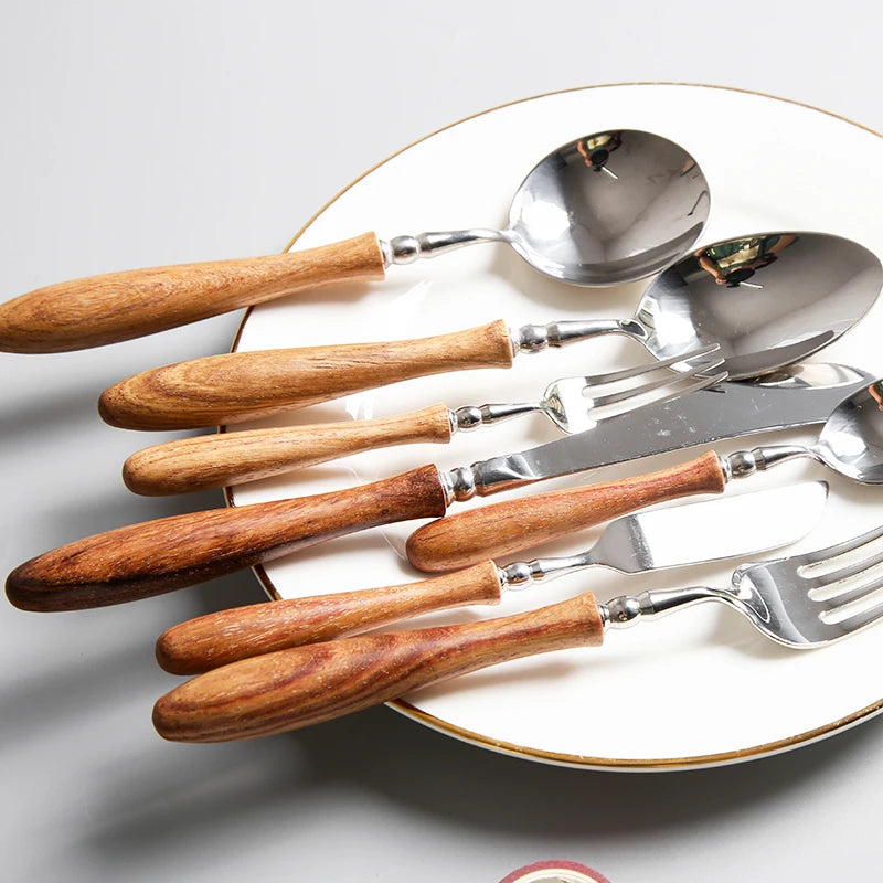 Elevate your dining experience with the Konco Wood Dinnerware Set. This stainless steel cutlery set includes knives, forks, and spoons, all beautifully complemented by wooden handles. With its timeless design and dishwasher-safe materials, this cutlery set combines elegance with practicality. Enhance your table setting and enjoy meals in style with this durable and versatile dinnerware set from Konco.