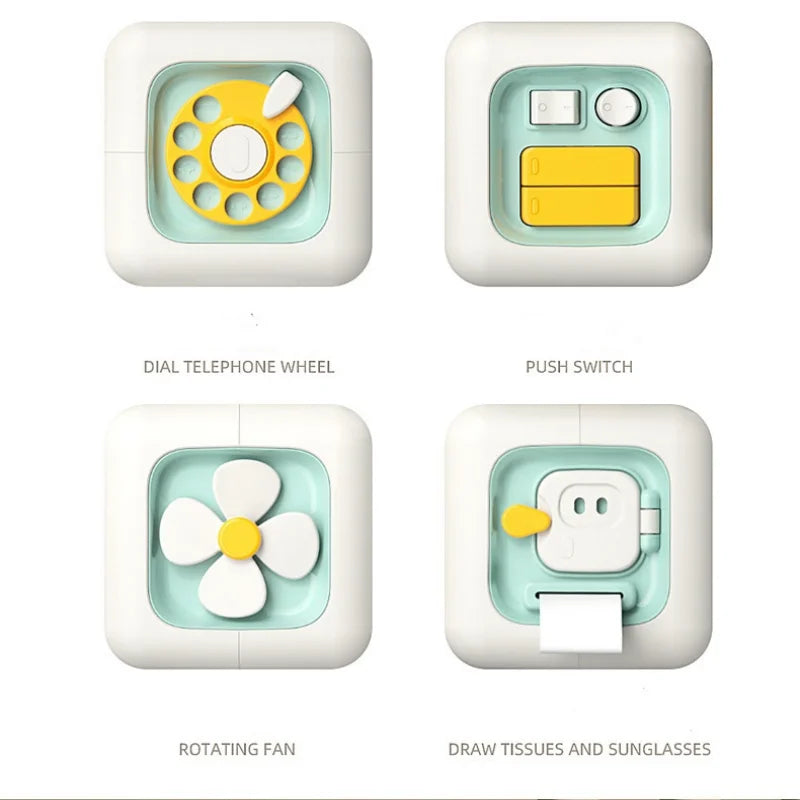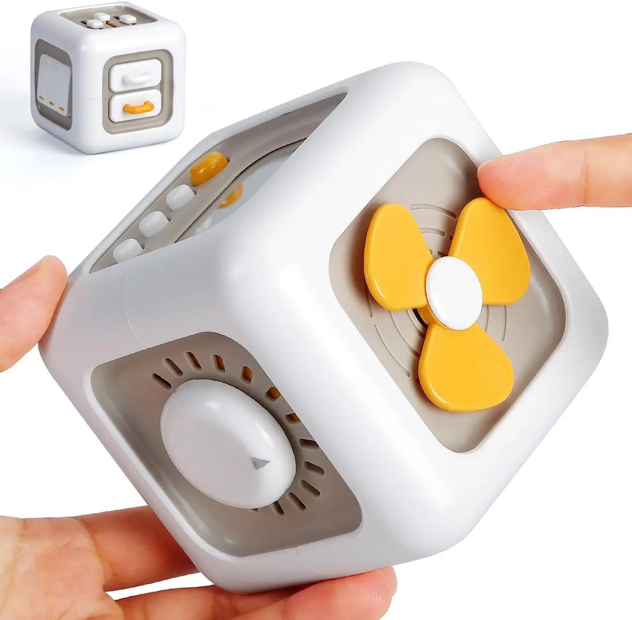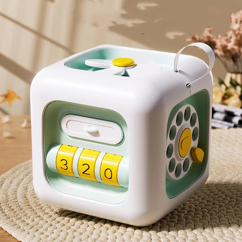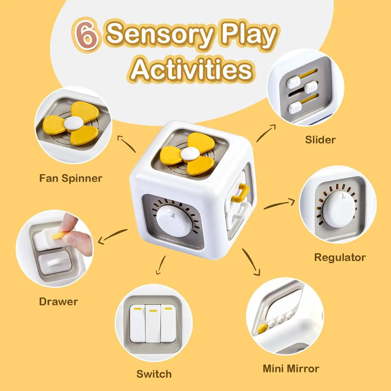 🎲【BABY SENSORY TOYS】The 6-in-1 activity cube is an interactive sensory toy for children. Each side of the cube features a activity, including rotating fan flade,drawer pull,mini mirror,switch button,timer twist,regulator slider .It is not only fun for kids but also encourages parent-child interaction.