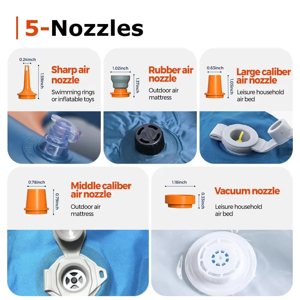 2.Multiple Nozzles for Multiple Needs: Equipped with five distinct nozzles, our pump is crafted to adapt to a variety of products. From beach balls to air mattresses, just swap the nozzle and you're good to go!