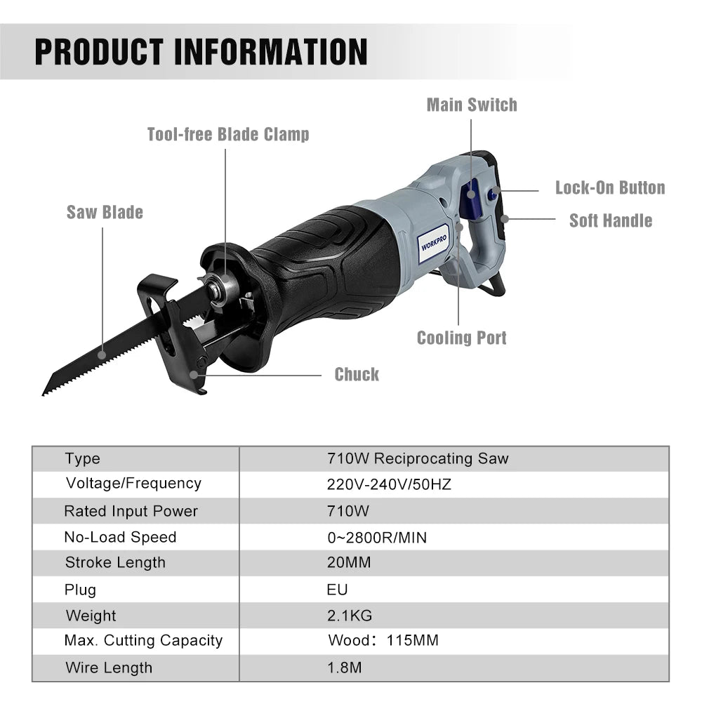 The WORKPRO 710W cordless electric reciprocating saw offers convenience and power for cutting wood and metal materials. With its cordless design, it provides portability and ease of use in various work environments. Equipped with four saw blades, it ensures versatility for different cutting tasks. Upgrade your toolkit with this reliable and efficient power tool from WORKPRO.
