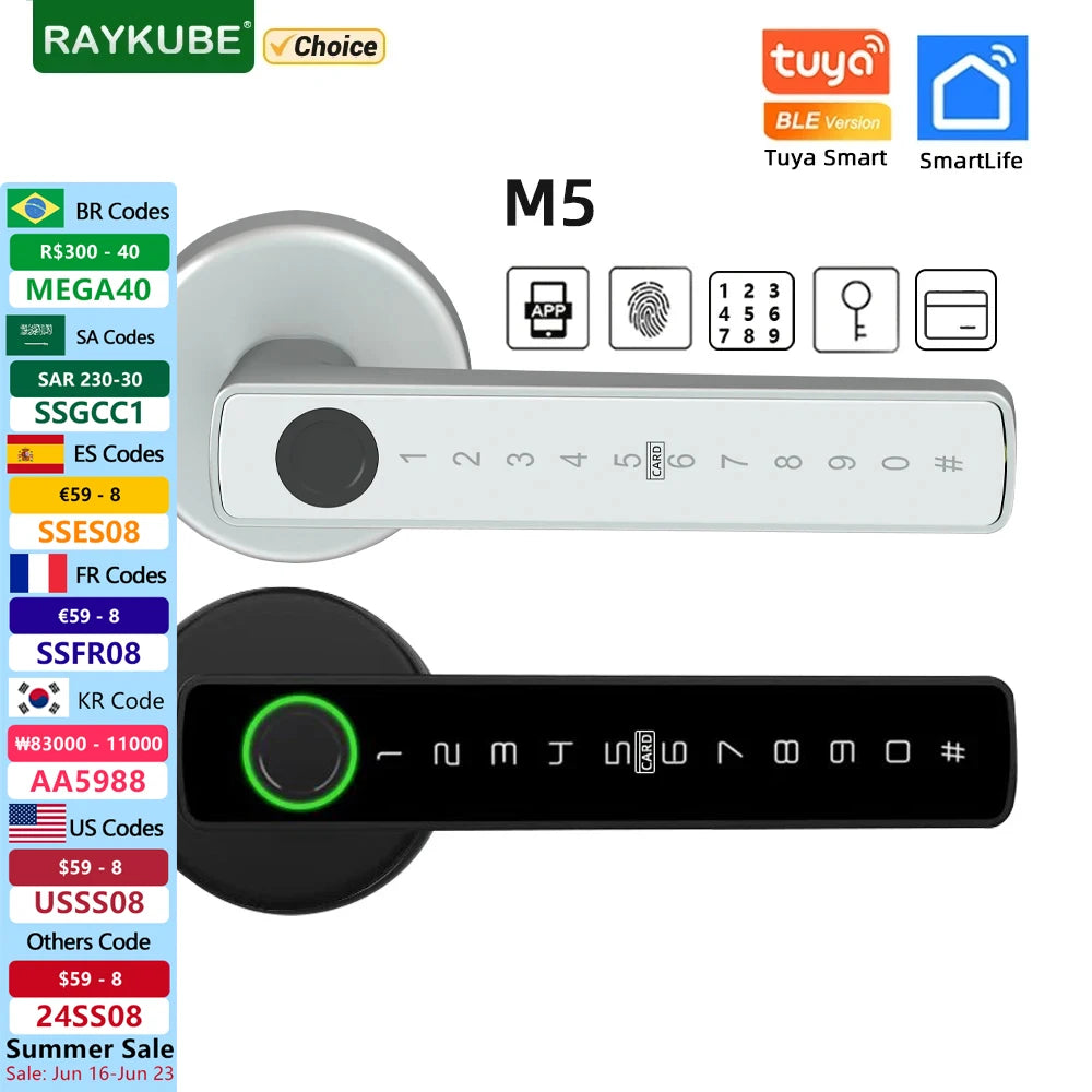 RAYKUBE M5 Tuya BLE Smart Fingerprint Door Lock Electronic Lock with Password/Key/Card/Smartlife/Tuya APP Unlock For Bedroom