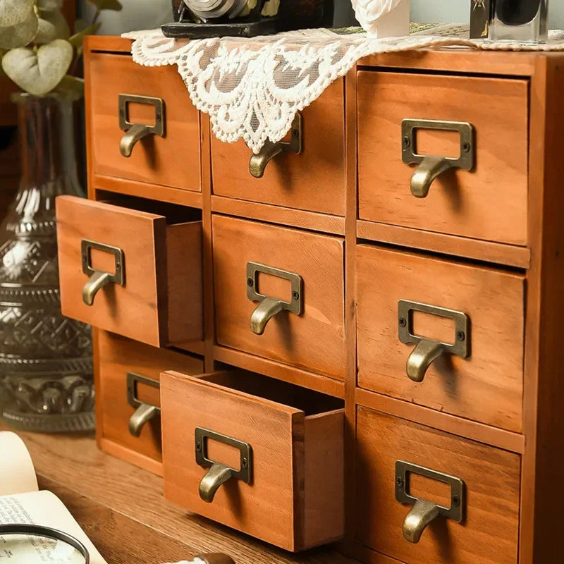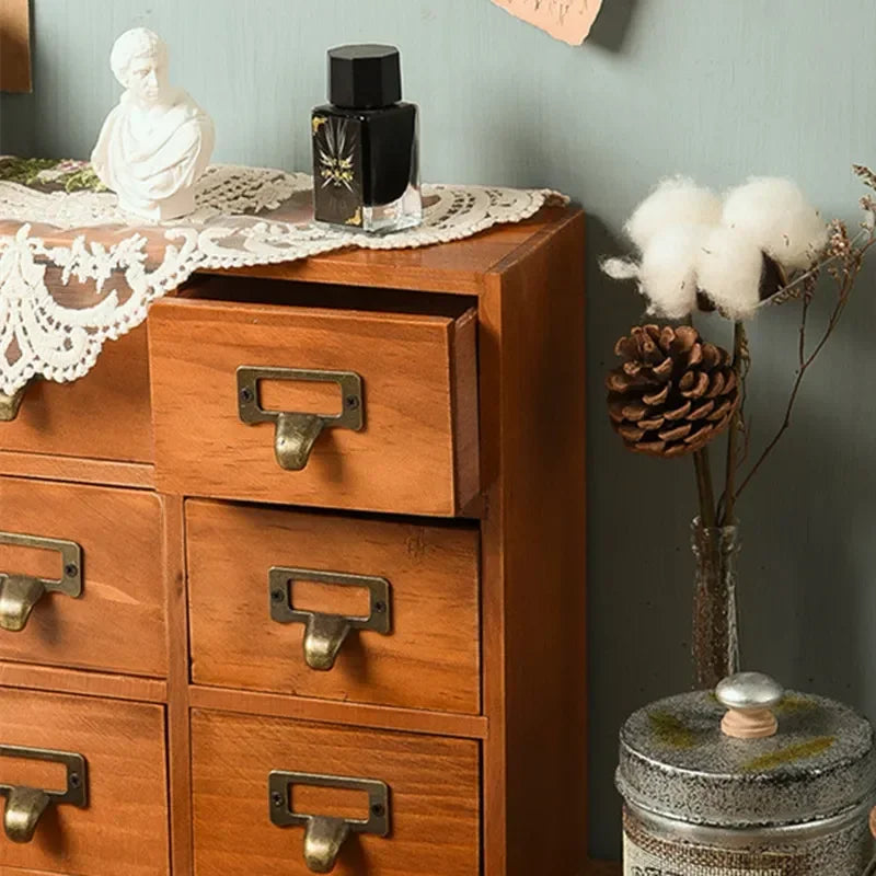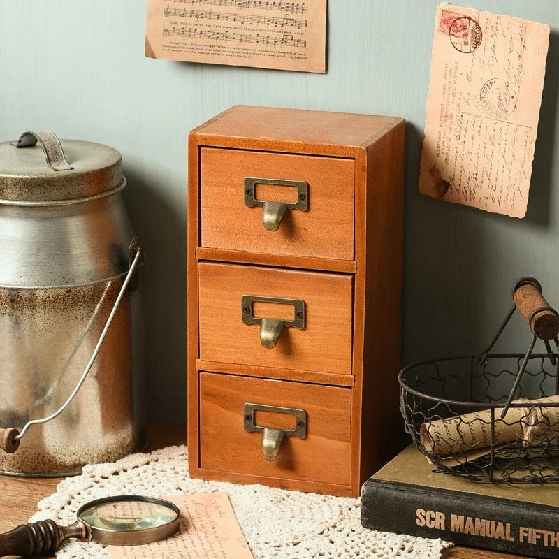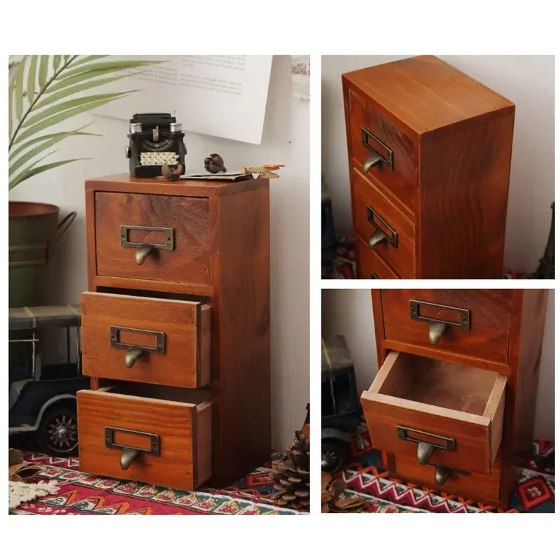 Embrace vintage charm with our Retro Small Toy Makeup Jewelry Organizer. Crafted from wood, this three-layered drawer unit offers versatile storage for toys, makeup, jewelry, or kitchen spices. Its compact design makes it perfect for desktops or countertops, adding a touch of nostalgia to your home decor while keeping essentials neatly organized.