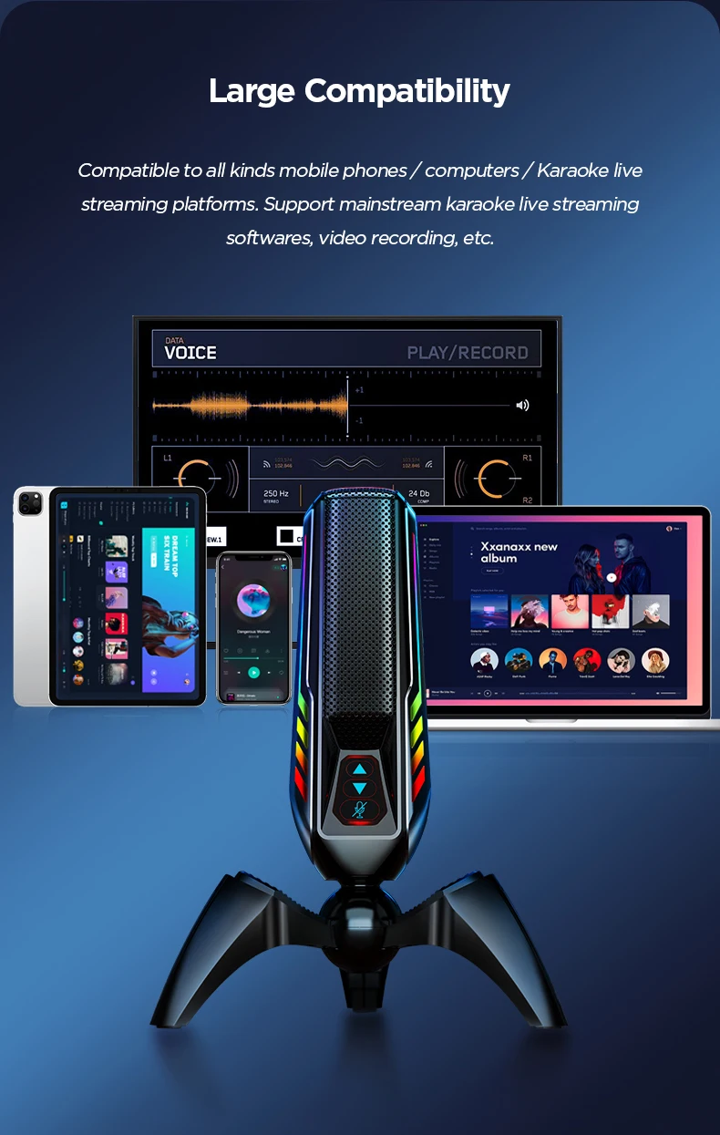 Upgrade your audio with this professional RGB USB condenser microphone, designed for live streaming, podcasting, gaming, and studio recording. Featuring noise-cancelling technology and an omnidirectional pickup pattern, it delivers clear, balanced sound for PC and computer use. The plug-and-play wired USB connection ensures easy setup with no drivers required, while the desktop tabletop design saves space and looks great on camera with dynamic RGB lighting. CE, FCC, and RoHS certified for reliable, high-quality performance—ideal for creators, streamers, and home studios.