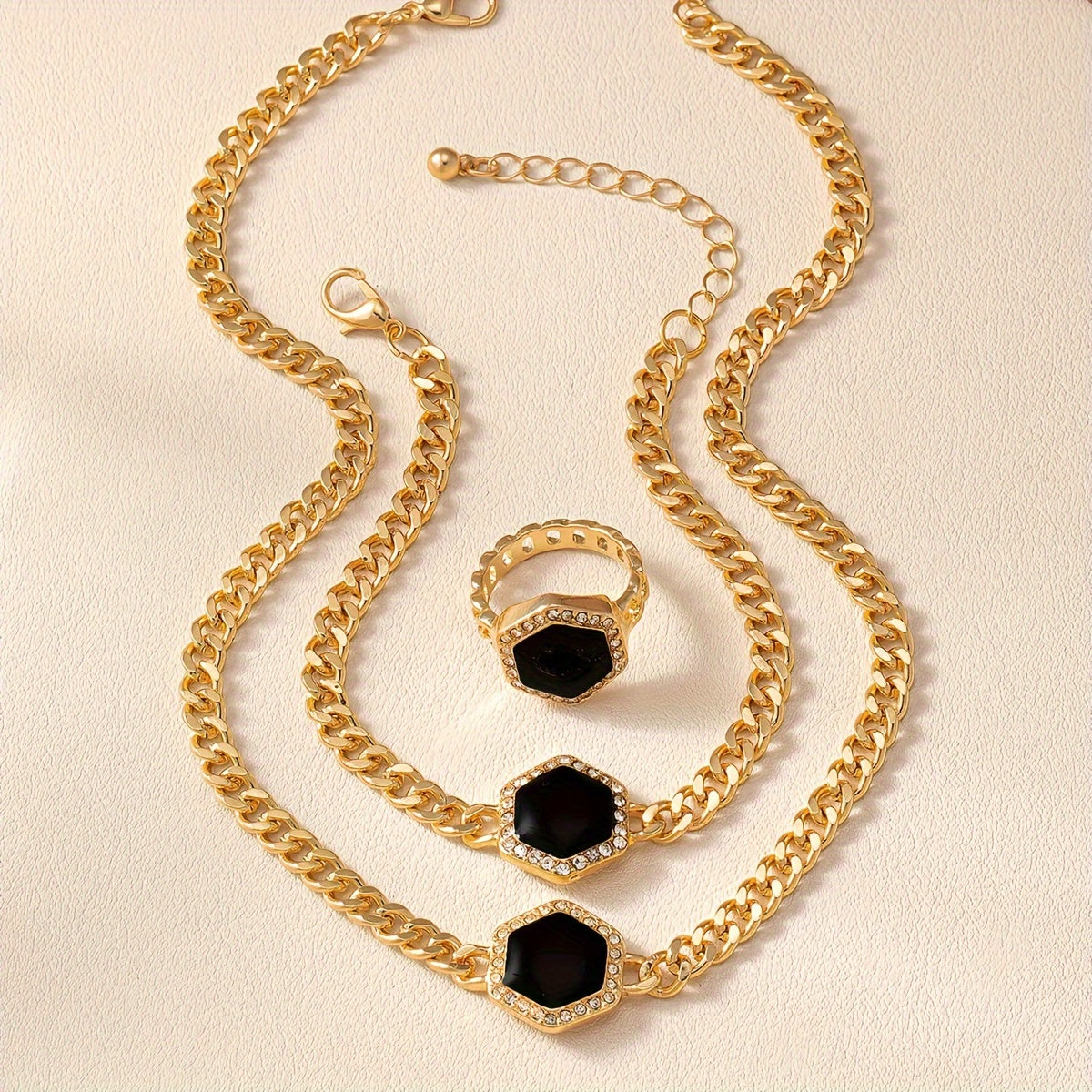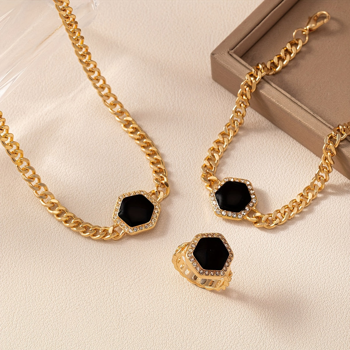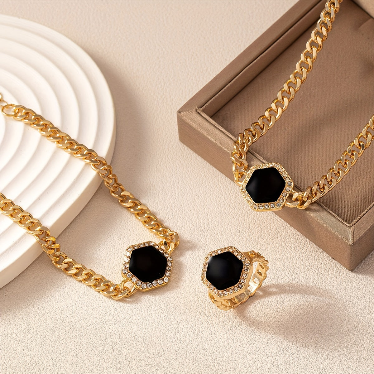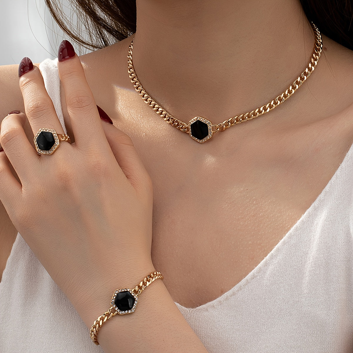 The centerpiece of this necklace is a sleek black hexagon pendant, a timeless symbol of balance and harmony. Paired with a delicate chain, the design reflects a perfect blend of simplicity and modern elegance. Ideal for casual outings, professional settings, or special occasions, this necklace effortlessly complements any outfit.