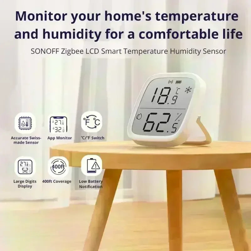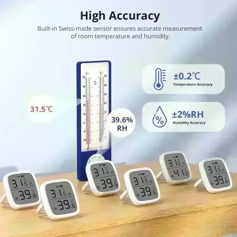 ewelinkSNZB-02D is a Zigbee temperature and humidity sensor with 2.5 inch LCD display with large bold numbers that can work with Zigbee 3.0 gateways like ewelinkZigbee Bridge Pro, ewelinkNSPanel Pro, ewelinkZBDongle-P/E, Alexa with Built-in Zigbee Hub,etc to monitor your home's temperature and humidity for a comfortable life, and there are icons to indicate Hot/Cold/Dry/Wet air conditions, reminding you to adjust your humidifier or dehumidifier accordingly to achieve optimal comfort, also power icons for you to know the current power usage, the high accuracy built-in swiss-made sensor ensures accurate measurement of room temperature and humidity, the temperature is accurate up to ±0.2℃ while the humidity is ±2%RH, data is updated every 5s, always gives you the latest changes in the environment.