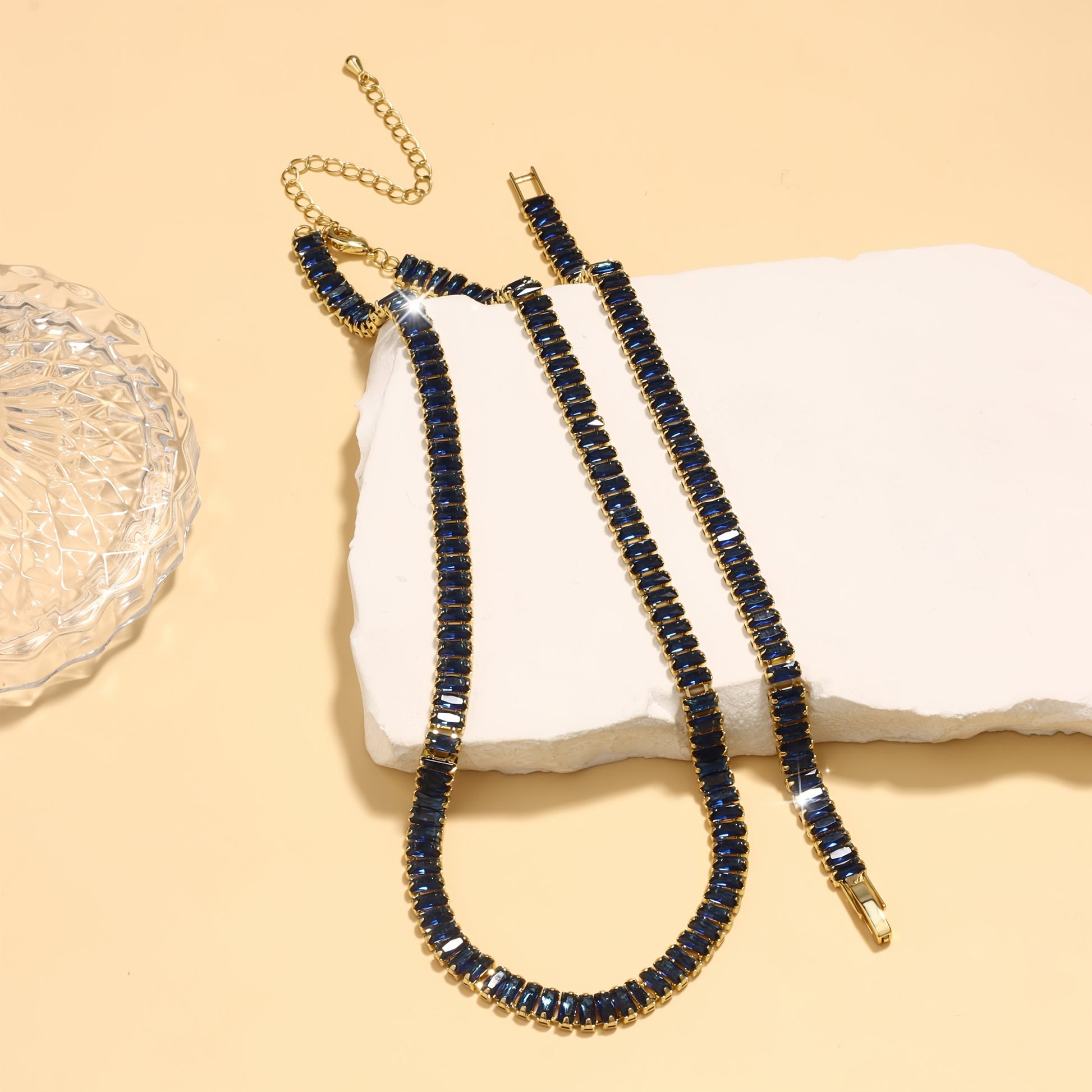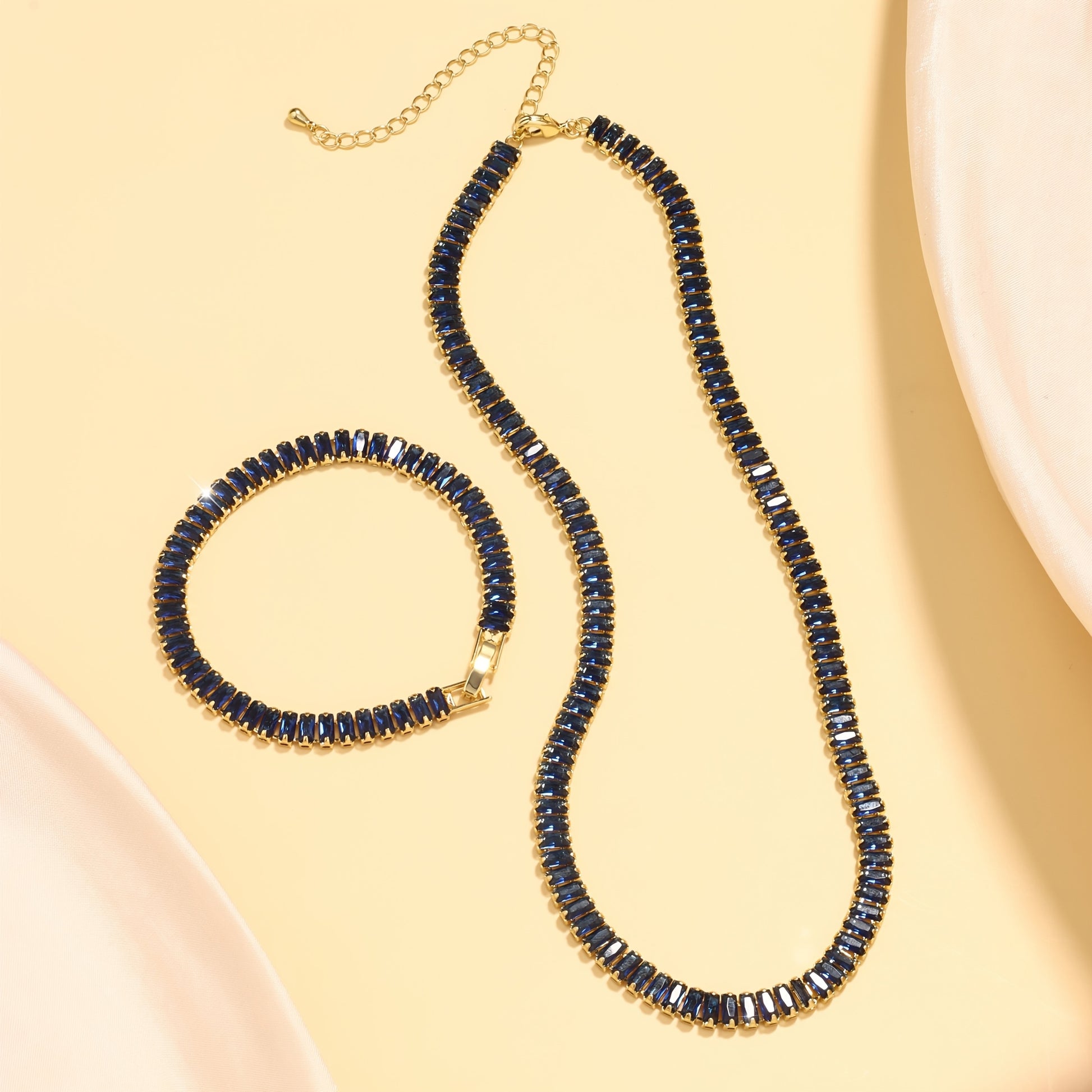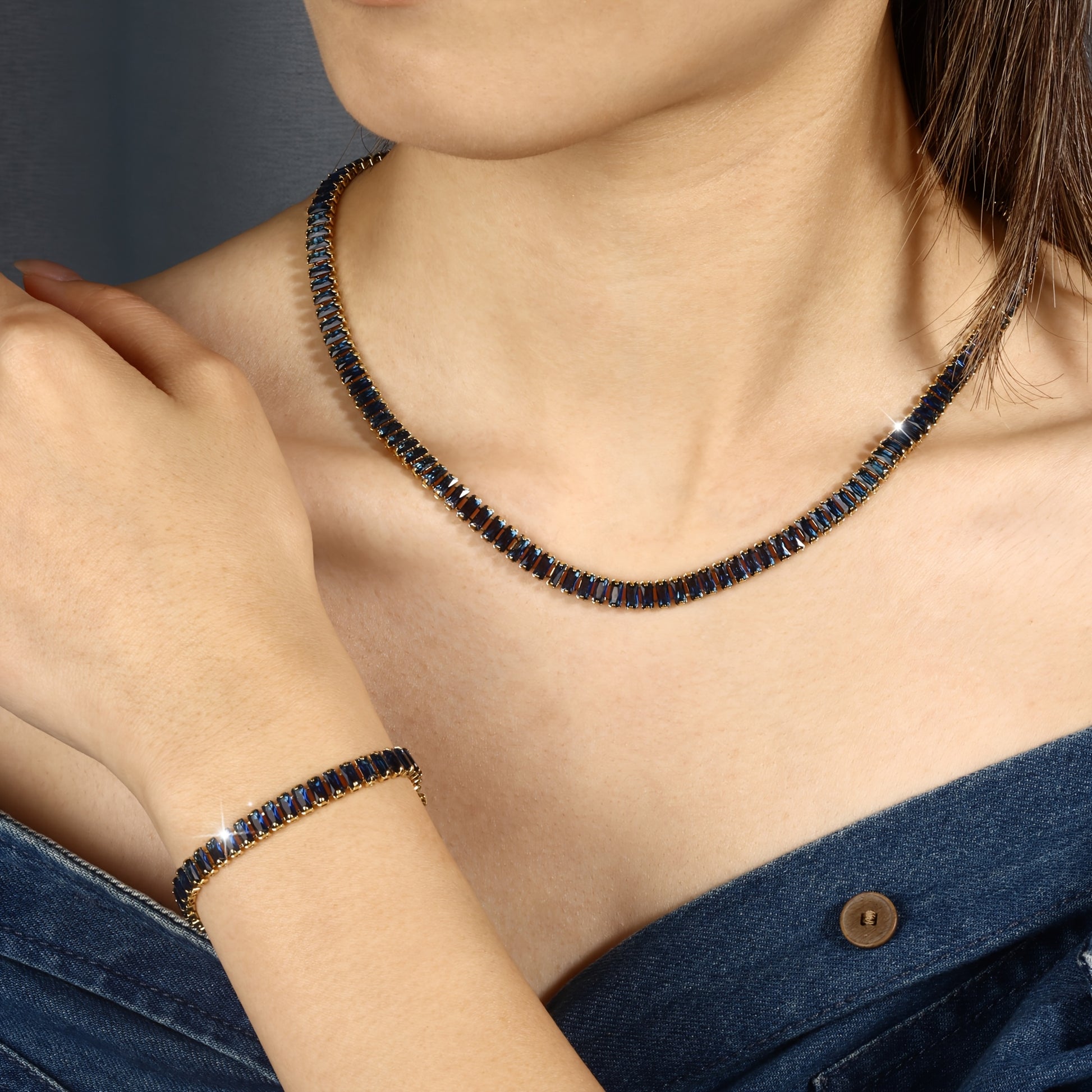 The centerpiece of this set is the classic tennis bracelet, featuring a single row of radiant stones that shimmer with every movement. Its sleek and minimal design makes it a versatile piece for any occasion. -