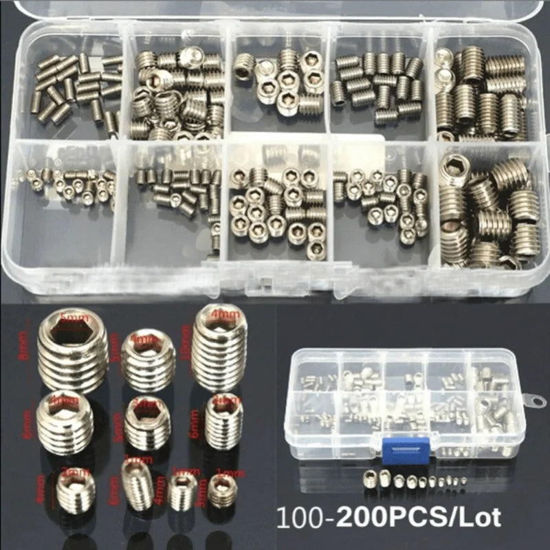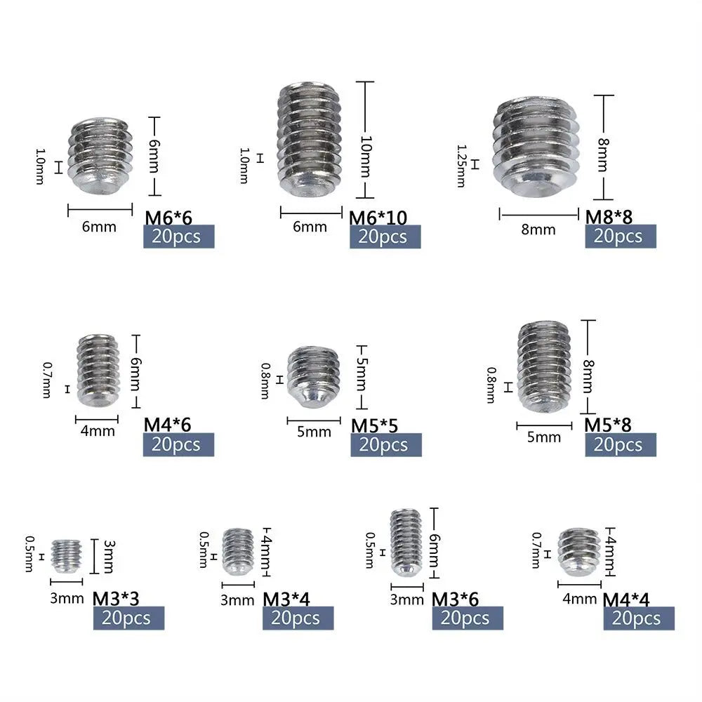 This assortment kit contains high-quality 304 stainless steel socket head hex set screws with cup points, available in metric sizes M3, M4, M5, M6, and M8. These versatile grub screws are ideal for various applications, offering secure fastening and precise alignment. Whether you're working on machinery, furniture, or DIY projects, this comprehensive set provides the right size screws to meet your needs.