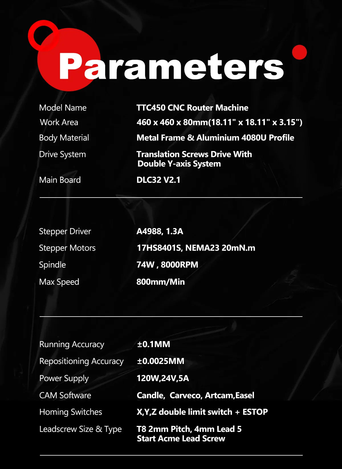 - Spindle parameters : 24V 5A, 775 motor 8000RPM