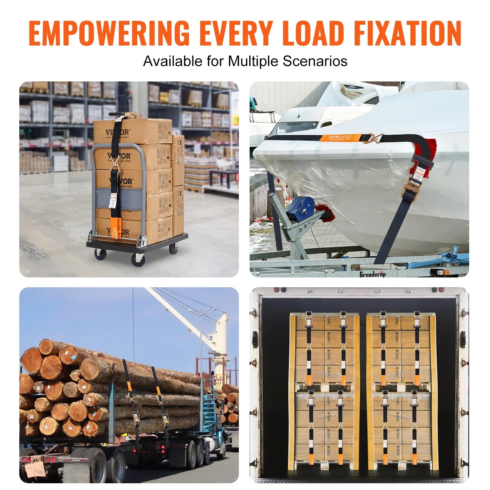 Versatile Application: VEVOR ratchet straps provide durable and reliable security for transporting various small and large objects, including motorcycles, canoes, kayaks, ATVs, boxes, boats, furniture, lawn equipment, heavy machinery, and other cargo via truck beds, trailers, or roof racks.
