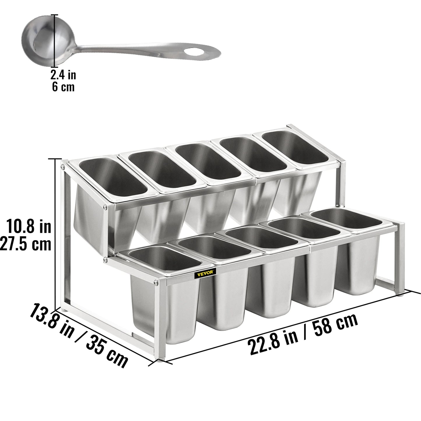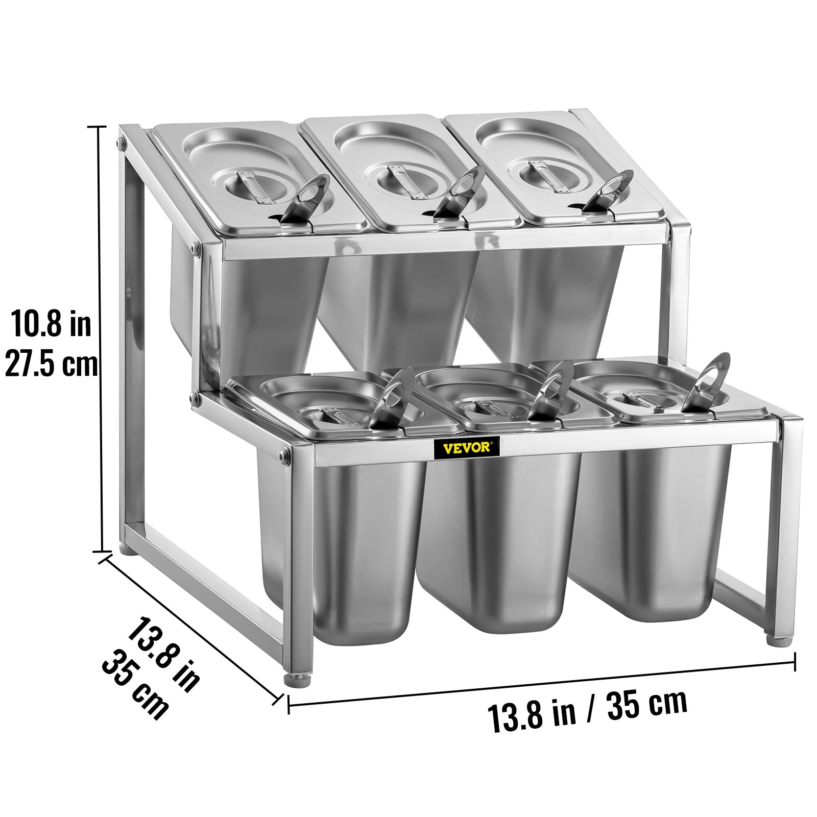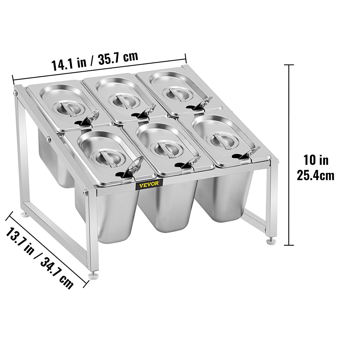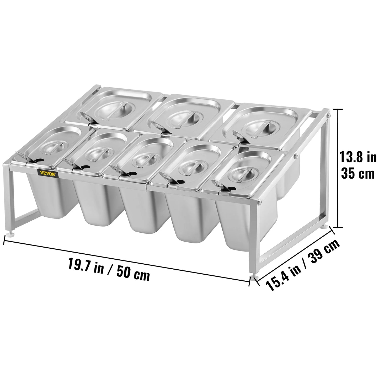 Organize your spices with ease using our VEVOR Commercial Spice Rack Seasoning Organizer. Made from durable stainless steel, this expandable shelf can accommodate 2 to 10 pans, providing ample space for storing various spices, food ingredients, and soup containers. Perfect for both commercial kitchens and home use, it helps keep your kitchen tidy and ingredients readily accessible.