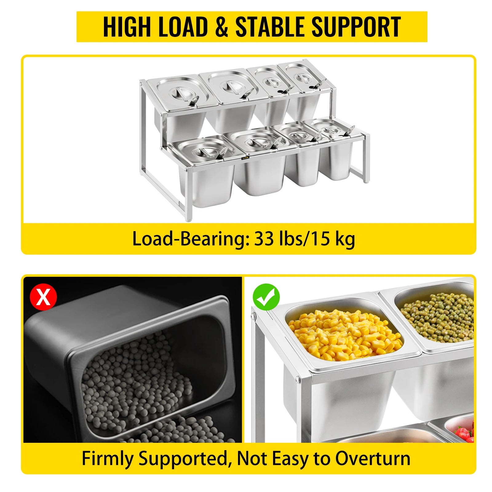 Compared with directly placing the food pans on the tabletop, which tends to be knocked over or overturned, this frame adopts durable stainless steel and provides firm support, holding multiple food pans stably. P.S. Its load-bearing capacity reaches 33 lbs/15 kg.