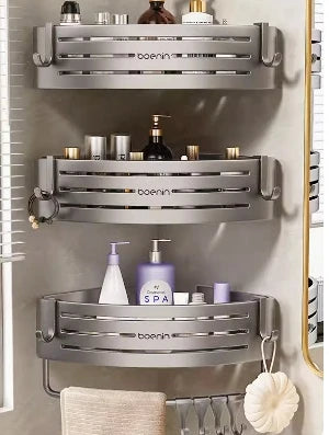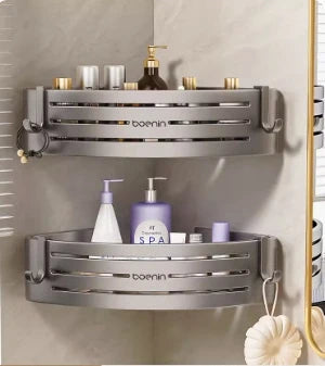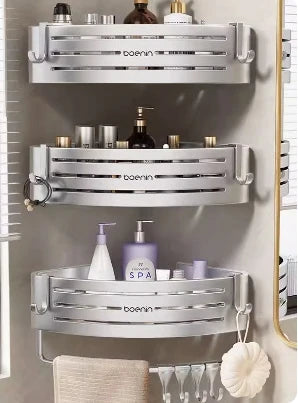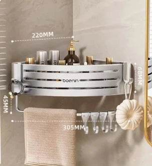 Maximize your bathroom storage with our wall-mounted shelves featuring a towel bar and hook. Constructed from space aluminum, this shower corner shelf offers durability and resistance to rust and corrosion. The integrated towel bar and hook provide convenient storage solutions for towels, robes, and other bathroom essentials. Organize your shower or kitchen with this versatile organizer rack, combining functionality and style seamlessly.