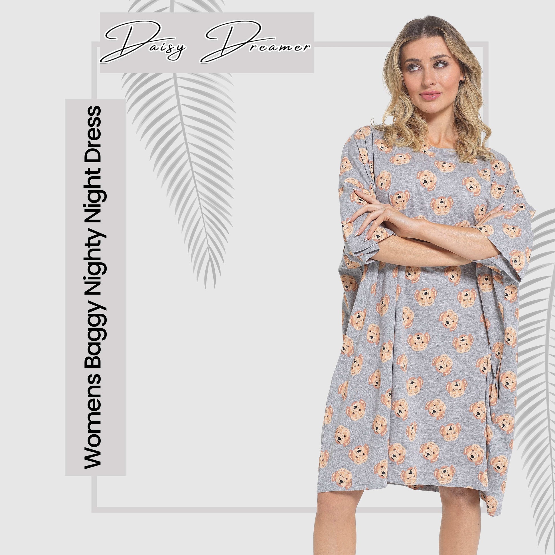 Description: Featuring delightful prints such as sloths, highland cows, sheep, cakes, and Yorkshire terriers, these baggy night dresses add a fun and playful vibe to your sleepwear collection. The charming motifs make bedtime something to look forward to.